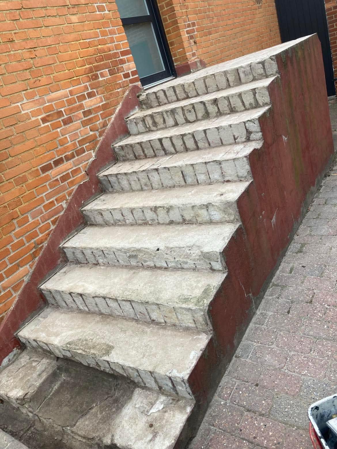 Trappen var medtaget efter mange års slid og havde både løse fuger og synlige skader i overfladen. Som erfaren murer i Sønderjylland startede jeg med en grundig afrensning og reparation af skaderne, hvorefter jeg påførte en stærk puds, som giver trappen et ensartet og stilrent udtryk.